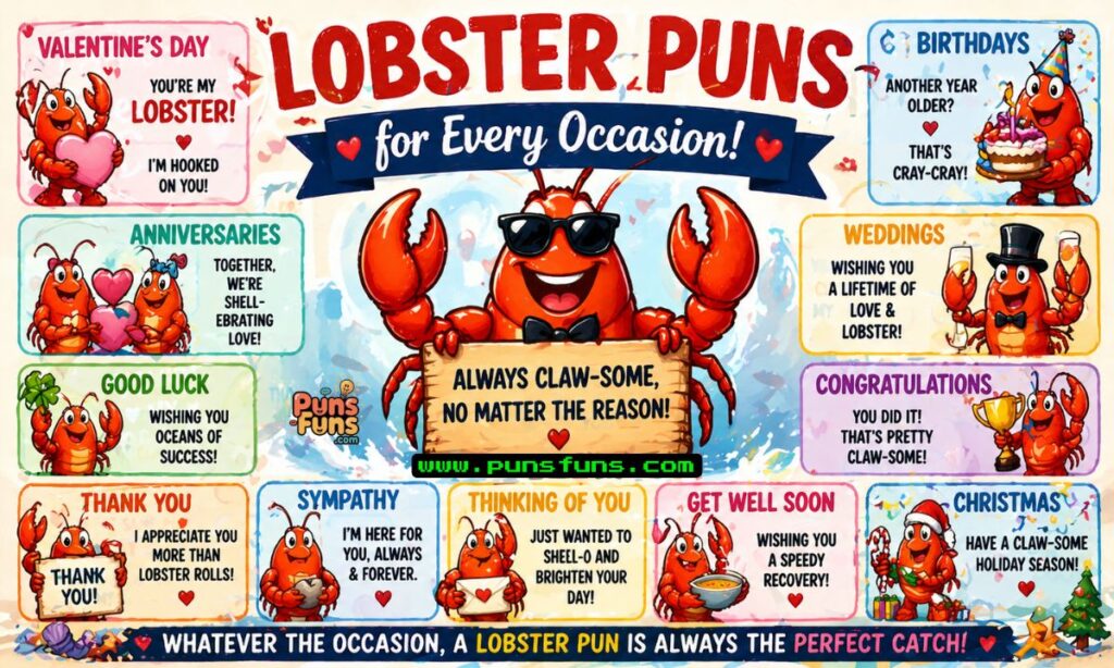 Whether you are writing a Valentine’s card for someone who is your “lobster,” planning a punny birthday message, or just trying to make your friends snort-laugh in a group chat, this collection of 250 lobster puns covers every occasion with claw-some creativity. Get ready — things are about to get shell-arious.